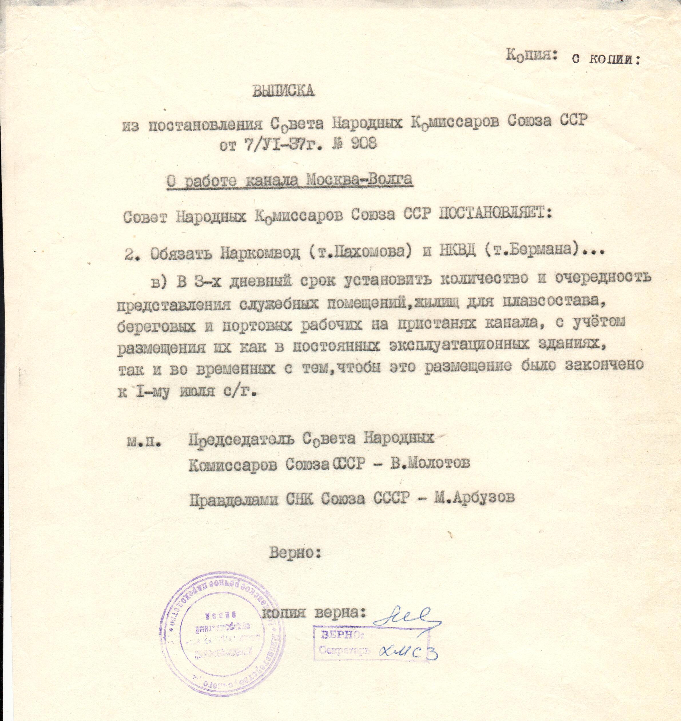 Из постановления СНК СССР № 590 от 9 апреля 1937 года: «В месячный срок внести на утверждение СНК предложения о проекте и сроках строительства судоремонтных мастерских в Хлебниково. Ремонт судов канала Москва — Волга в зиму 1937 — 1938 года обеспечить путём организации в Хлебниково временной ремонтной базы». Подпись: Председатель Совета Народных Комиссаров Союза ССР В.Молотов, Управляющий делами Совета Народных Комиссаров Союза ССР М.Арбузов.